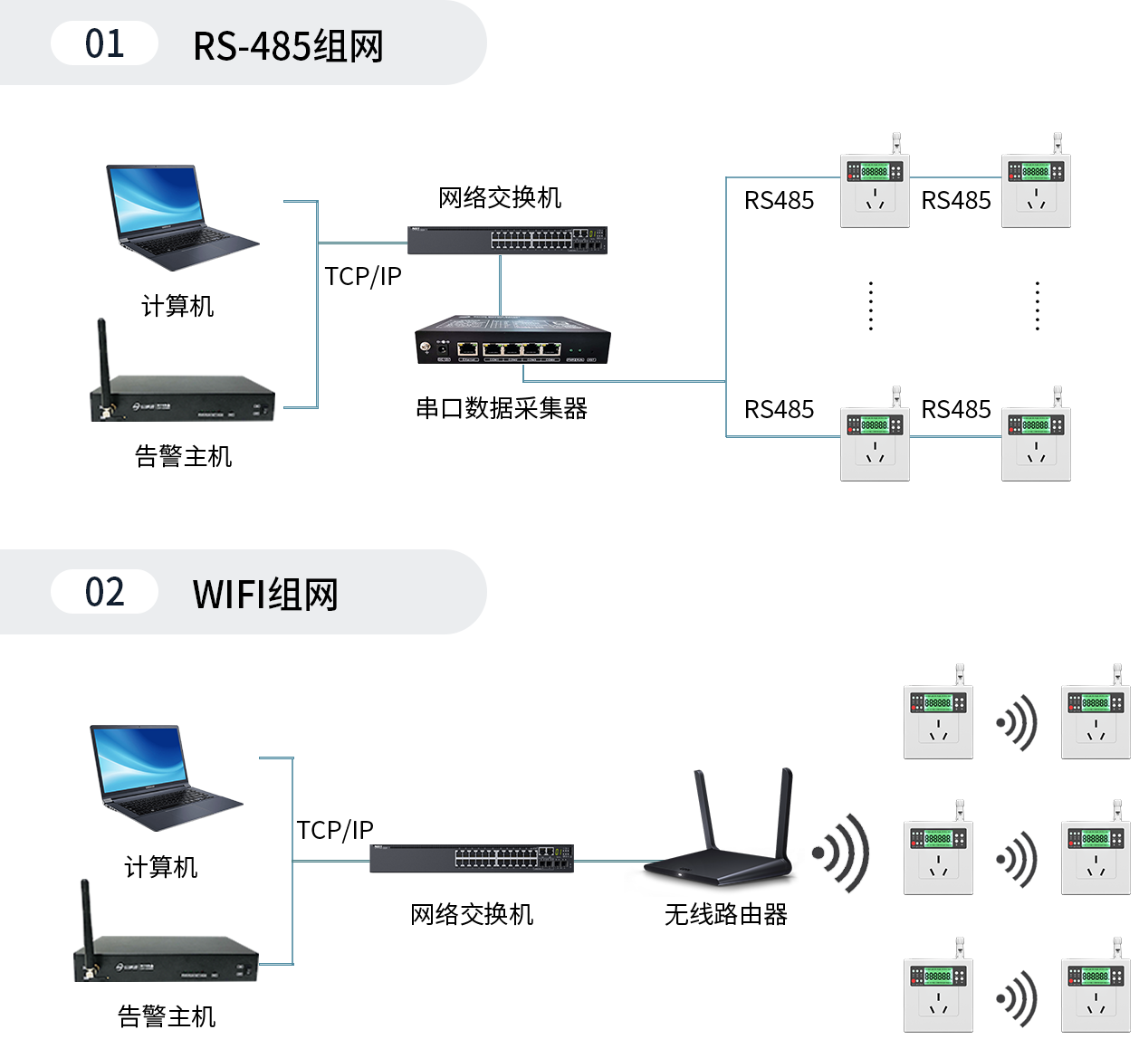 ACsmart智能節能空調控制器默認裝配RS485通訊接口,通常用485總線“手拉手”方式將多臺智能空調控制器進行集中組網;對選配WiFi通訊模塊的智能空調控制器,可直接通過WiFi直連空調控制器去修改其配置參數,同時支持WiFi局域網組網實現實時查看所有空調的開關狀態、運行參數及用電詳情等信息,其系統組網圖如左側所示。